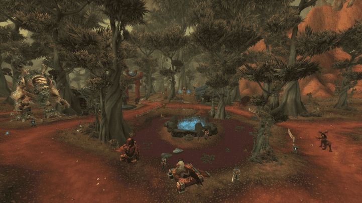 Amidst all this death and rock, there is a hidden surprise. If you travel west, you stumble upon Ruuan Weald (Evergrove). Suddenly, the spikes disappear. The sky turns a calming purple, and you are surrounded by lush, magical trees and Night Elf architecture. Finding this tiny pocket of nature after spending some time in the dusty canyons feels like finding an oasis in a desert. It shows that even in the sharpest place on Draenor, life finds a way.