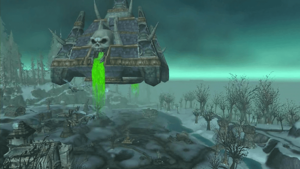 Despite its desolation, the zone hosts a surprising number of settlements and strongholds, each shaped by the land’s strategic and symbolic value. To the east, Wintergarde Keep rises as a bastion of human resistance, while the Forsaken stronghold of Venomspite anchors Horde-aligned interests nearby. Above this eastern expanse once loomed Naxxramas, the floating necropolis whose shadow reinforced the region’s association with death.