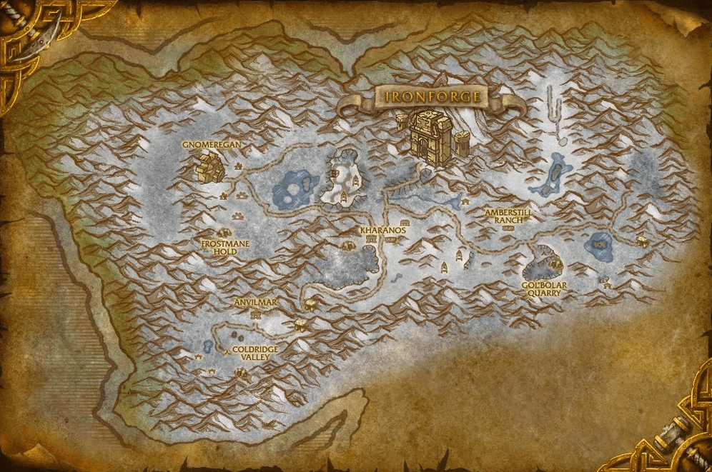 Surrounded by rocky mountains all around, it’s a high altitude, cold and windy region, a natural safe haven from the threats outside. But that doesn’t make it uninhabitable. Great forests of pine trees are scattered around, with snow leopards, bears, wolves, boars calling it home for themselves, while the people seek warmth in small villages around, or in the mighty capital that carves itself inside the mountains, Ironforge.