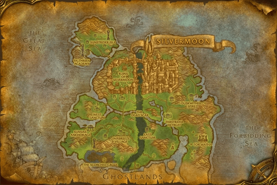 If Eversong Woods looks like a paradise with a scar through it, that scar is what shaped the Eversong Woods. The Dead Scar isn’t just some weird and cool design choice, it’s the exact path Arthas and his Scourge carved when they marched on Silvermoon. Picture golden trees burning, the sky dark with smoke, and undead cutting a straight line through what was once the elves’ pride. That scar remains as a permanent reminder of that day, an open wound that never healed.