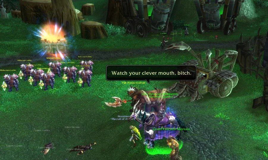 Despite his aggression, he still possessed a strict orcish honor. In the Stonetalon Mountains, he personally executed one of his own generals, Overlord Krom’gar, for murdering innocent druids, famously stating no matter how dire the battle is, never forsake your honor. This strict moral code also led to one of the most iconic and satisfying interactions in WoW history. During the Silverpine Forest questline, Sylvanas Windrunner proudly showed Garrosh how she used the Val’kyr to raise dead humans as new Forsaken, essentially mimicking the Lich King. Garrosh was utterly disgusted by this dishonorable necromancy. He confronted the Banshee Queen directly, dropping the legendary line, “Watch your clever mouth, bitch.” (A line so savage that Blizzard later censored it from the game). Even back then, Garrosh saw exactly the dark path Sylvanas was walking, and for many players, seeing him put her in her place was a profoundly satisfying moment.
