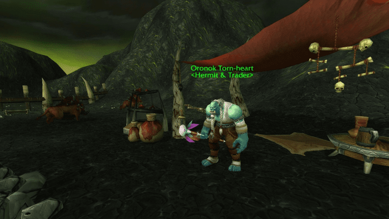 One of the most memorable storylines in the entire game is hidden in this green wasteland, involving an old, exiled Orc named Oronok Torn-heart. You find him north, in his farm with domesticated felboars, regretting his past. He was a warlock who served the Shadow Council, but he lost everything.